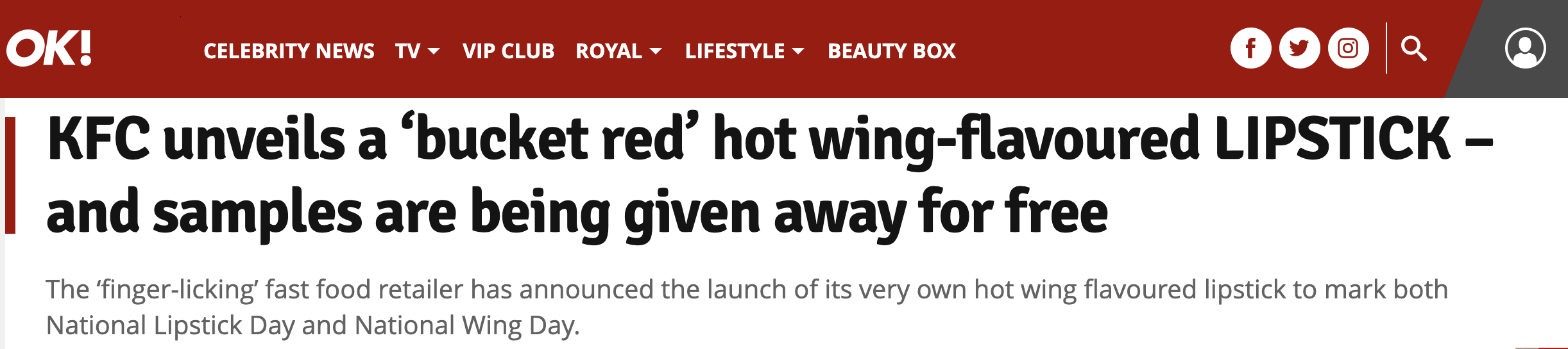 Exactly what it sounds like - a chicken wing-flavored lipstick from KFC - it’s the perfect way to celebrate both occasions with one sizzling product. We sampled flavors, developed mouth-watering options, and brainstormed irresistibly catchy names.